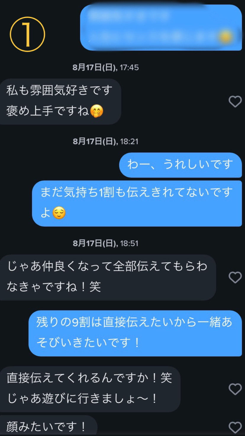 女性側は1日で50人とかからメッセージが来るし、特にTinderは、だらだらとやり取りするのを嫌う子が多いです。